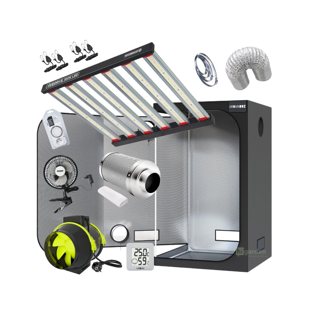Kompletní pěstební LED set 360W s profesionálním svítidlem Maxibright VARIDRIVE pro plochu 100×100 cm. Úsporná alternativa k 600W HPS s vysokým výkonem 1040 µmol/s, nízkou produkcí tepla a kompletní ventilací včetně uhlíkového filtru. Ideální řešení pro růst i květ v domácích podmínkách.