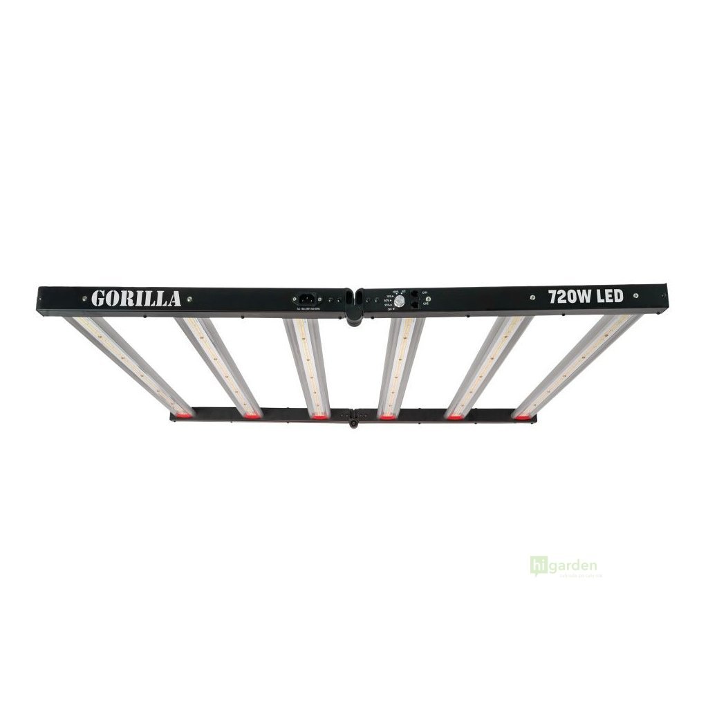 - GORILLA 720W LED GEN-III - výkonné LED svítidlo 720W s plnospektrálním světlem a vysokou účinností 2,7 µmol/J. Ideální pro plochy 1,2 × 1,2 až 1,5 × 1,5 m, s možností stmívání a sklopnou konstrukcí pro snadnou montáž