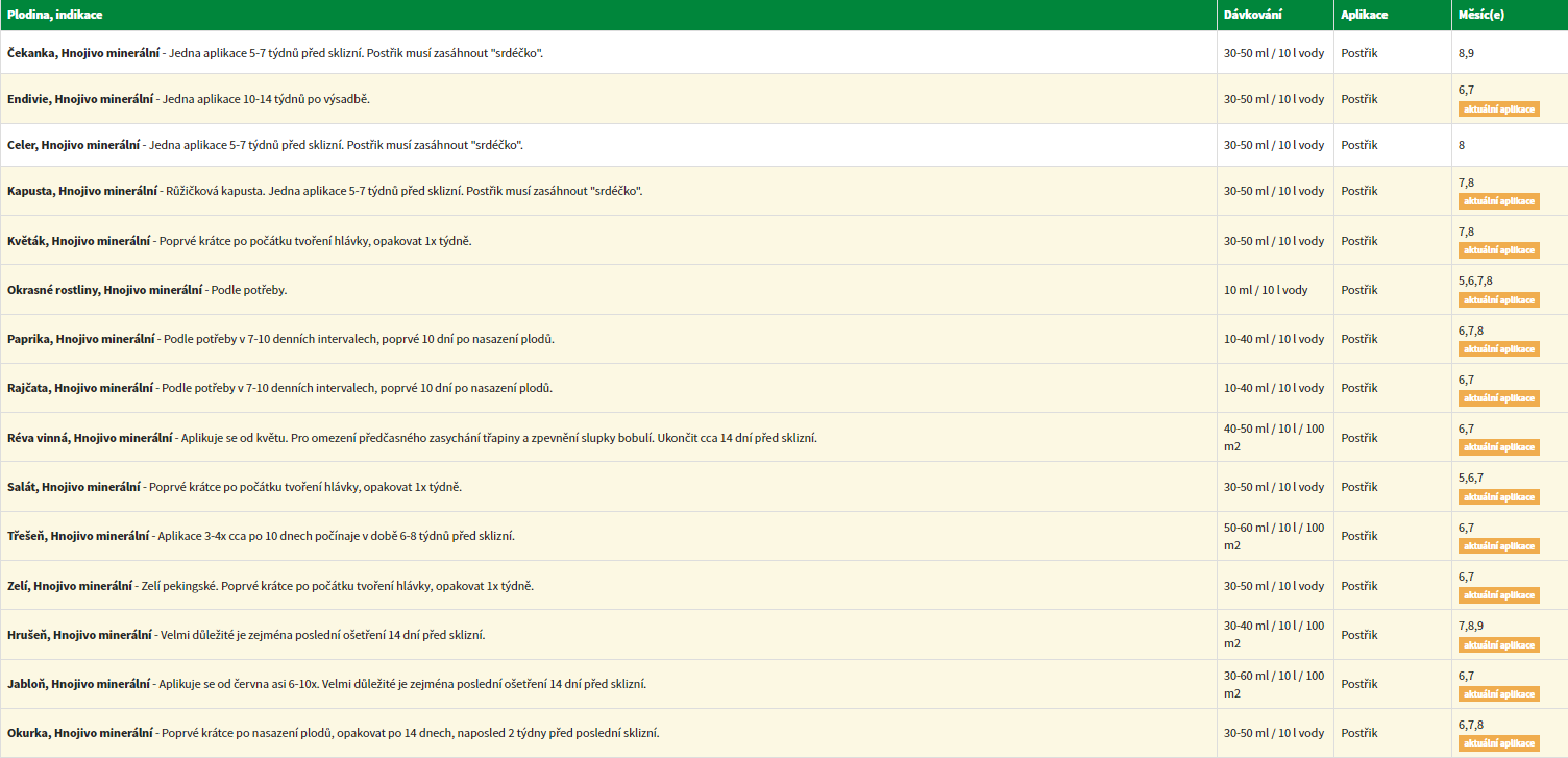 Aplikace: postřikem od vývinu plodů nebo při zjištění prvních příznaků poruchy, neaplikuje se na květy