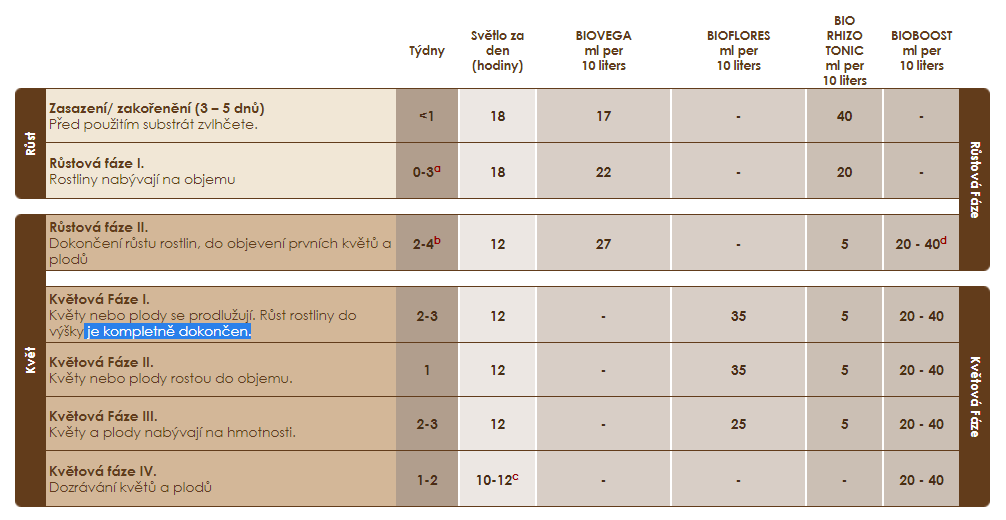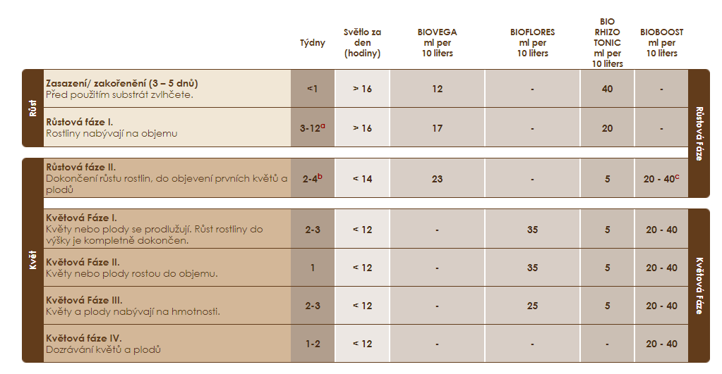- Organická hnojiva BioCanna dávkujte na základě tabulky s ohledem na vývojové stádium, ve kterém se rostlina nachází.