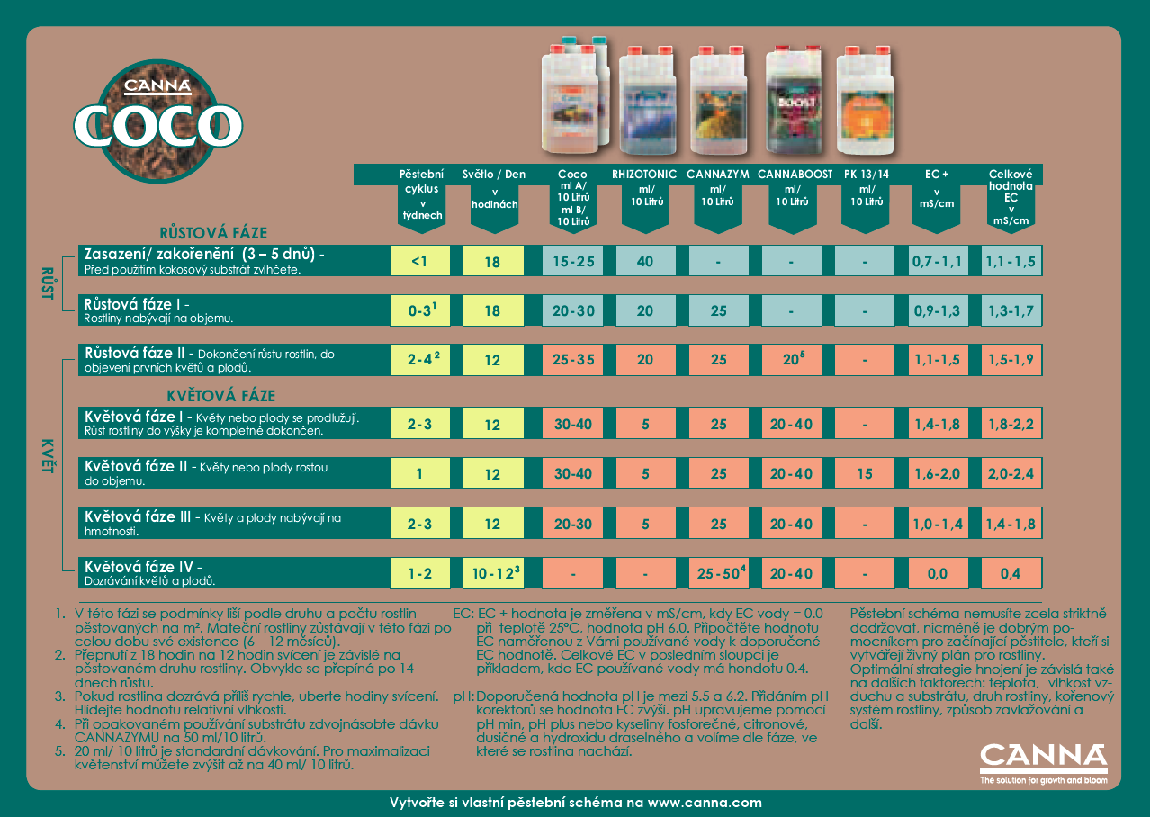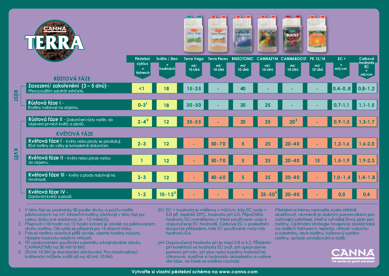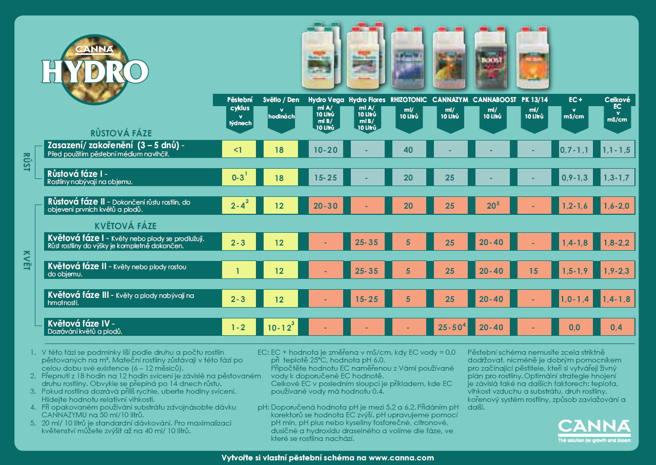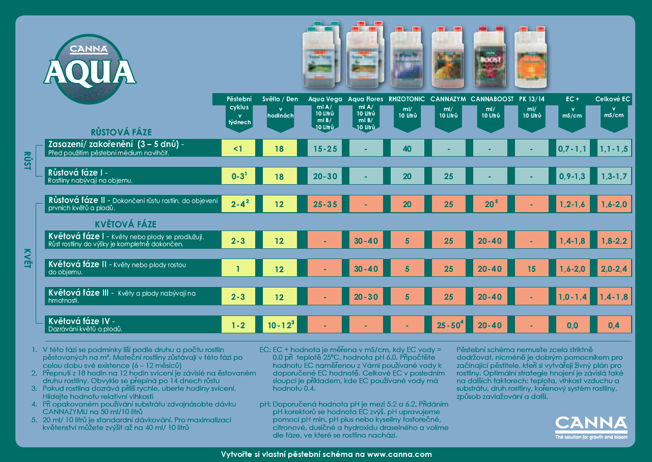 - Canna dává pěstitelům do rukou také unikátní doplňková hnojiva pro vyšší výnosy a kvalitnější úrodu. Kořenový stimulátor RHIZOTONIC, enzymatické hnojivo CANNAZYM i květové stimulátory CANNABOOST či PK 13/14. Dávkování těchto produktů je po boku základních hnojiv také zahrnuto ve všech čtyřech tabulkách.