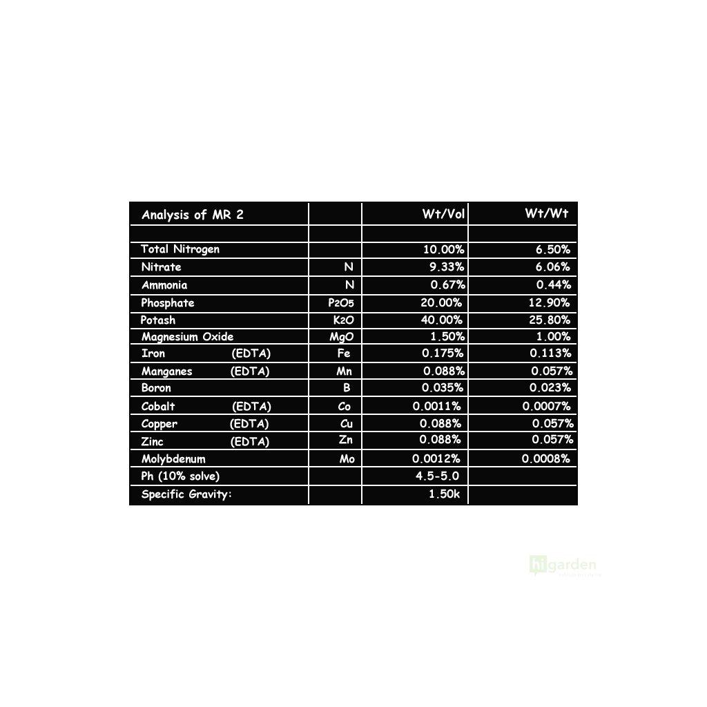 Metrop MR2 je vysoce kvalitní rostlinný extrakt obsahující všechny makro a mikro složky potřebné pro zdravý vývoj květu v jakémkoliv pěstebním mediu. Kvalita vstupních prvků a použití chelatačního činidla EDTA umožňuje rostlině rychle vstřebávat látky obsažené v hnojivu. Díky těmto vlastnostem je při shodné hodnotě EC s běžnými hnojivy možné dodat rostlině znatelně více výživy.