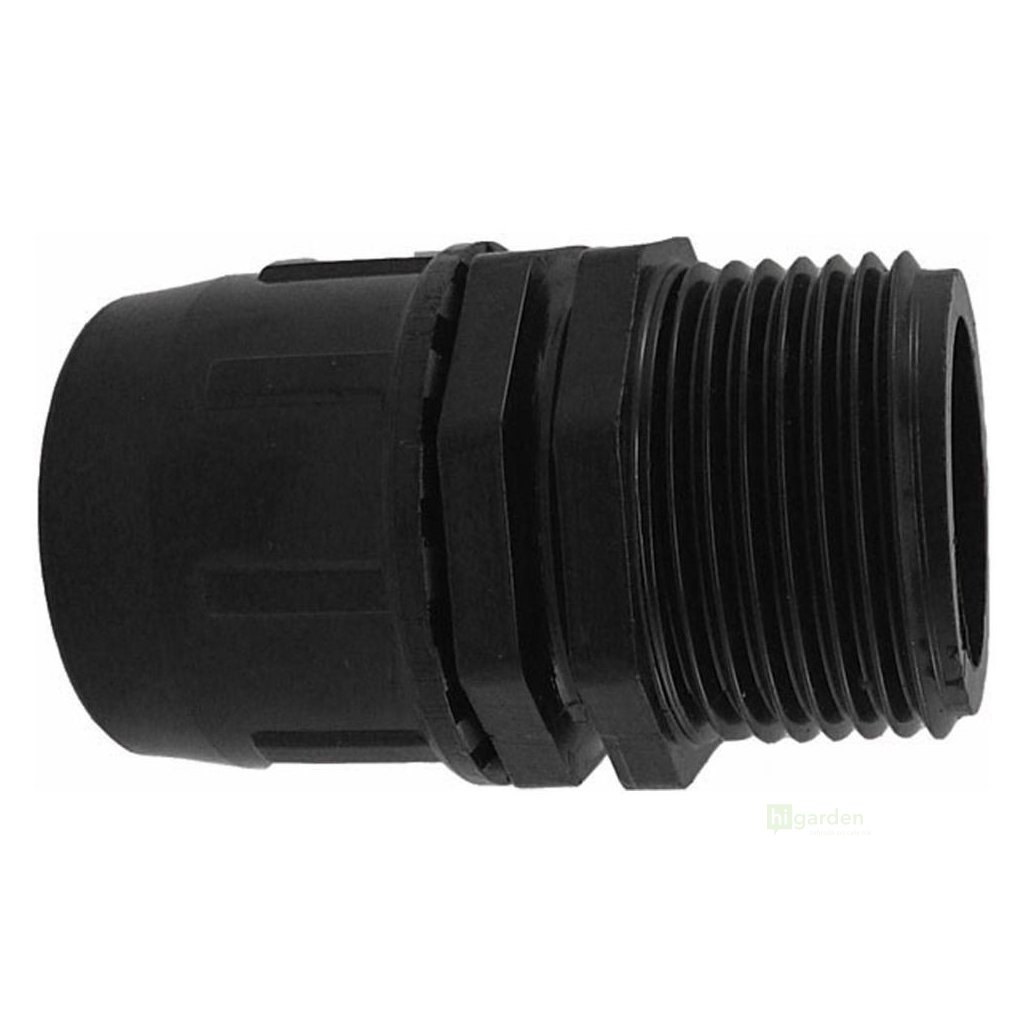 Přípoj vnější závit do tlakové závlahy Irritec. Průměr 25 mm (1″) x 1″ . "Easy" komponenty se snadno instalují a díky plastové matce jsou chráněny před vyškubnutím z hadice.