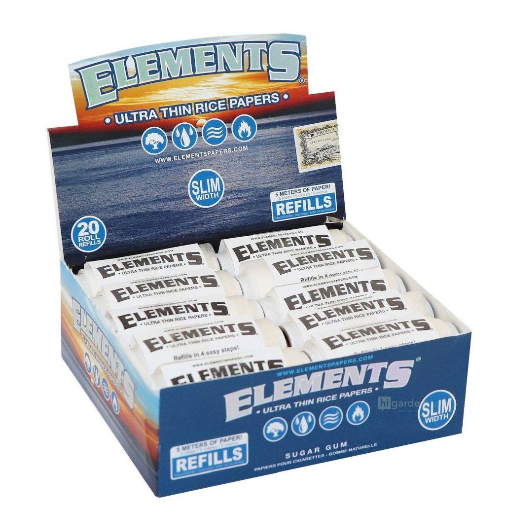 Pomalu hořící, rýžové rolovací papírky Elements Rolls King Size Slim jsou 5 metrů dlouhé. Lepení zajišťuje přírodní guma. Náhradní náplň do plastového pouzdra.